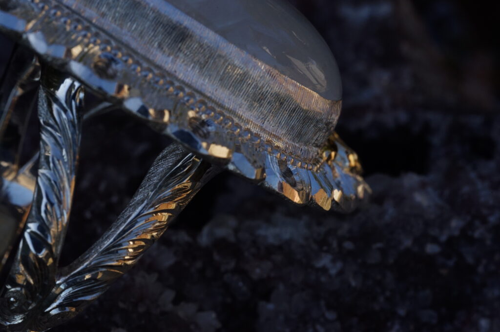 変色しない素材にはカット面の輝きを活かす彫りを施します。