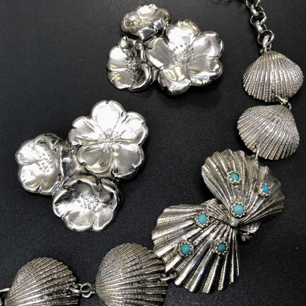 1枚のシルバーの板をフィレンチェ伝統技法で打ち出し、立体にしていくお二人の作品は、ポエティック。