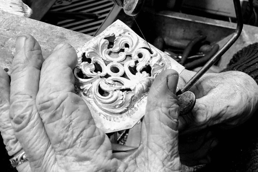 フィレンツェの古典的な打ち出し技法を受け継ぎ、守ってきたフォリア銀工房の2代目マエストロ、フォリア・ジュリアーノとその技法に魅せられた日本のジュエリー作家、フォリア真理。