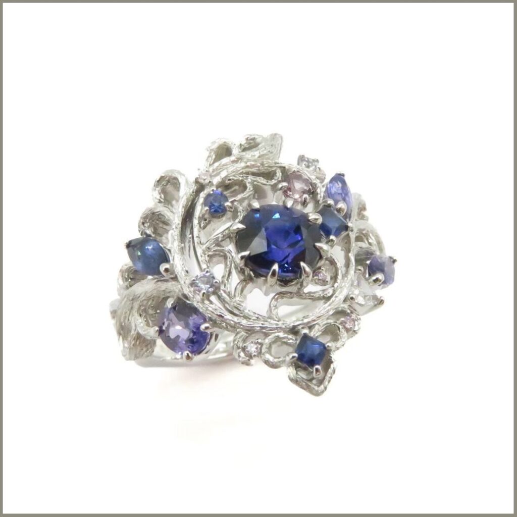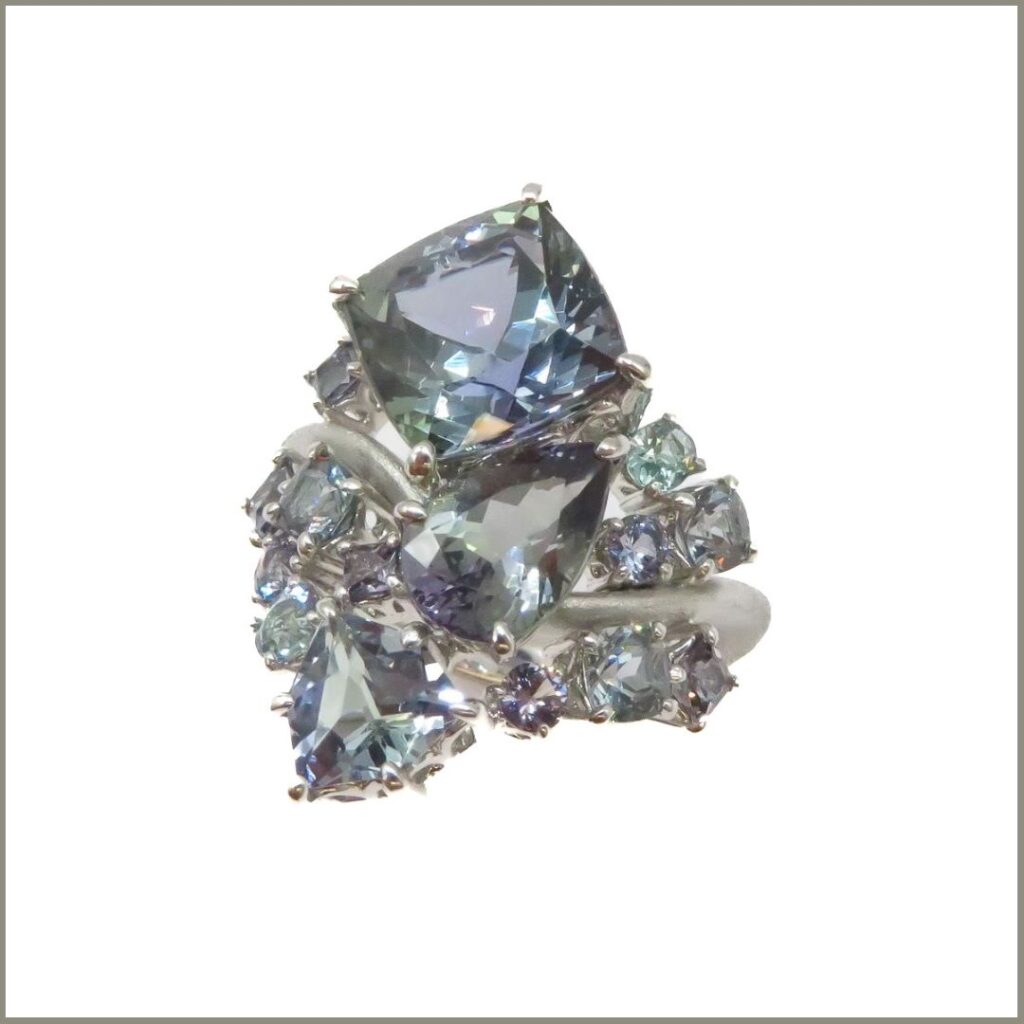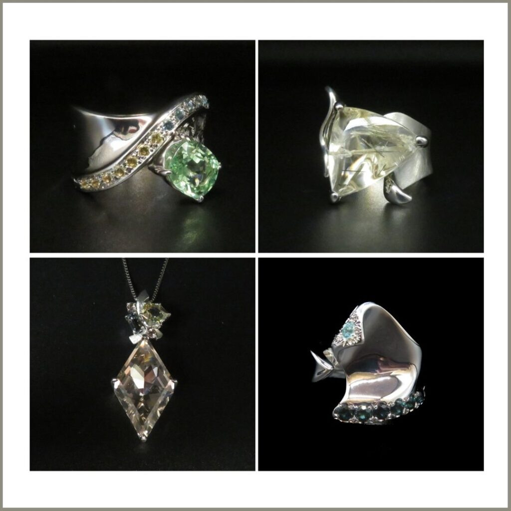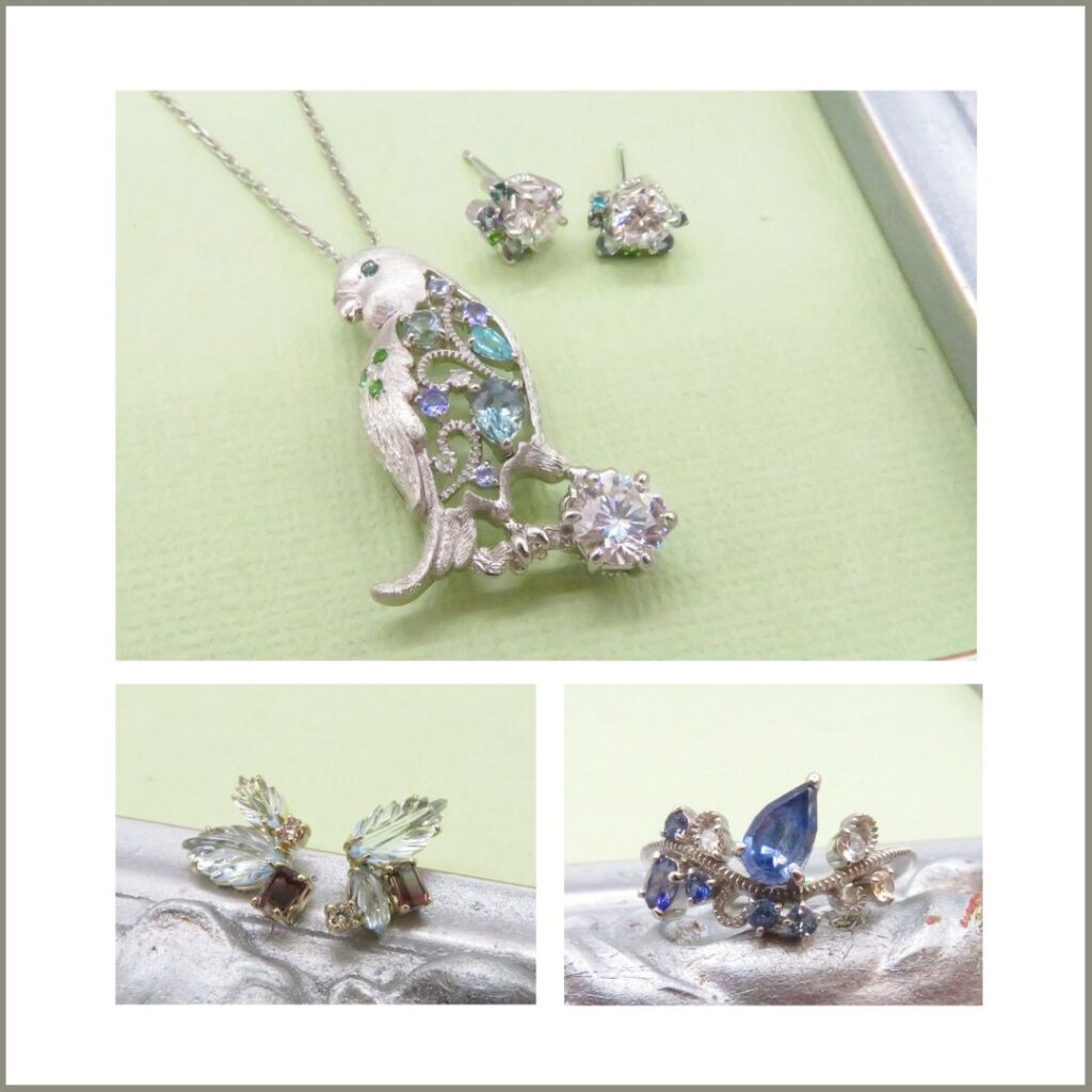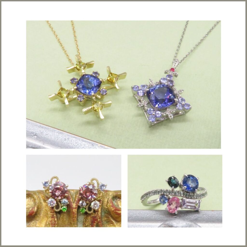 モンタナサファイア、パライバトルマリン、タンザナイト、アレキサンドライト、デマントイドガーネット、ローズカットダイヤモンド、ダイヤモンド
