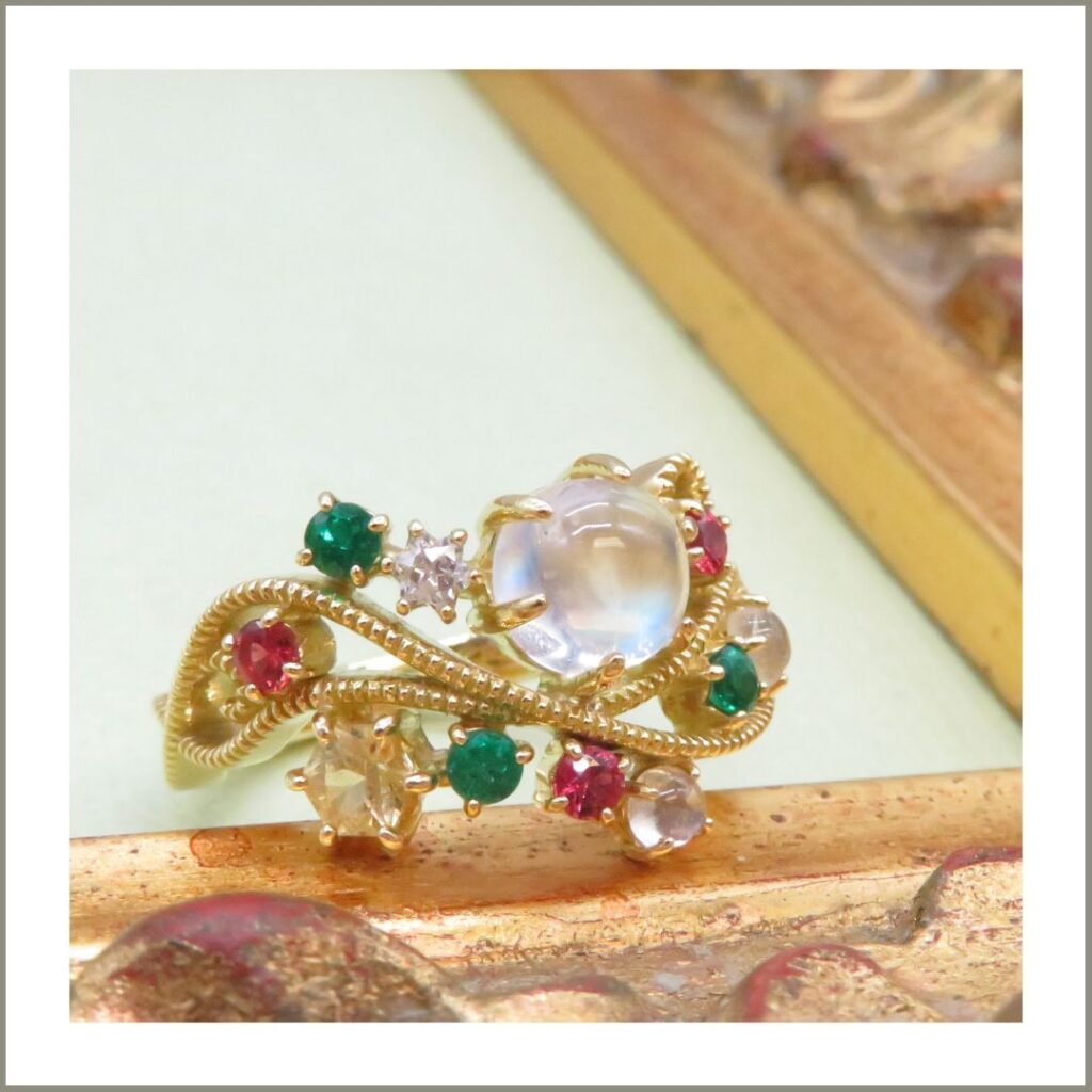 レインボームーンストーン、エメラルド、スピネル、サファイア、ダイヤモンド