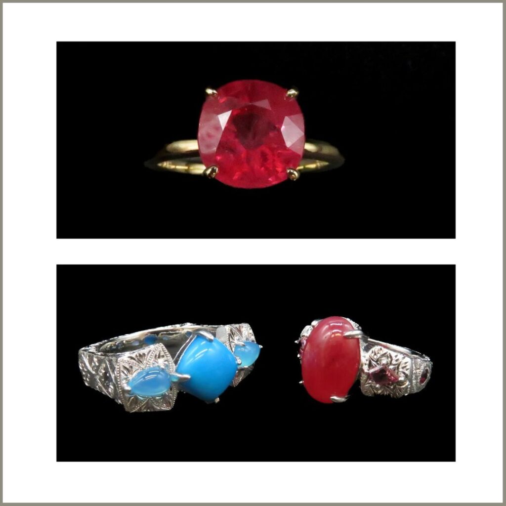 血赤珊瑚、ホワイトサファイア、レッドサファイア、スピネル、ドラゴンガーネット、ダイヤモンド