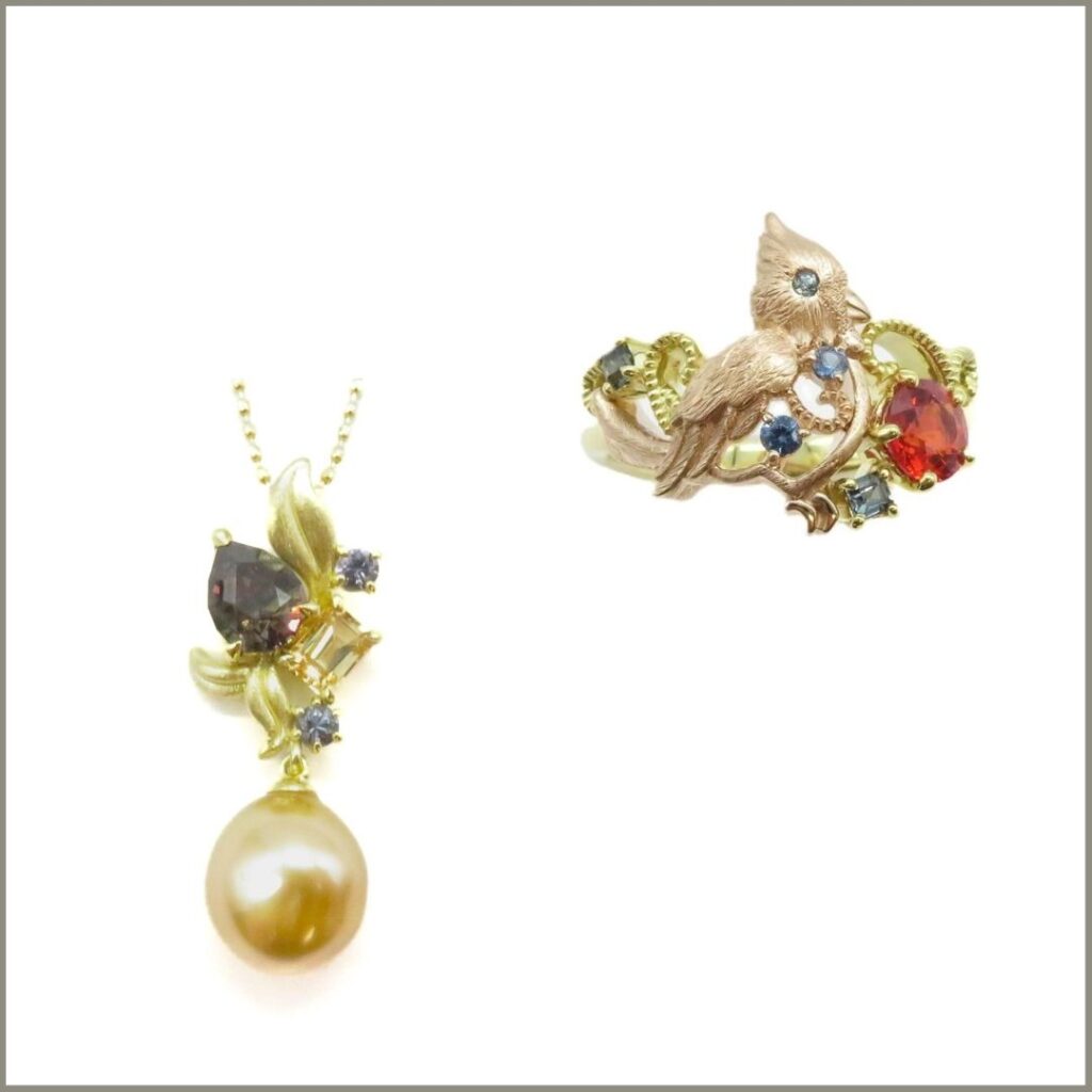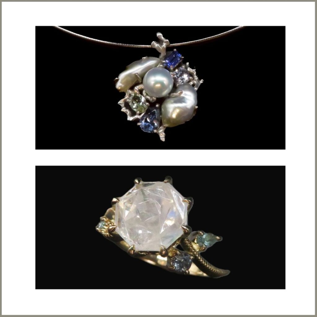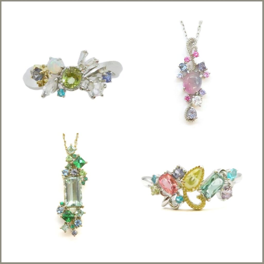 ミントトルマリン、レインボームーンストーン、ジルコン、ルビー、ダイヤモンド、トルマリン、アクアマリン、デマントイドガーネット、モルガナイト、湖水真珠