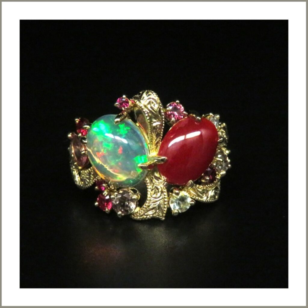 血赤珊瑚、メキシコオパール、サファイア、スピネル、ドラゴンガーネット、ハイアライトオパール、ダイヤモンド