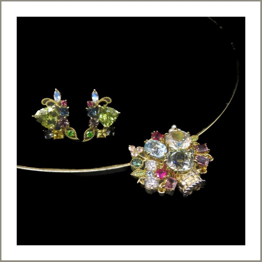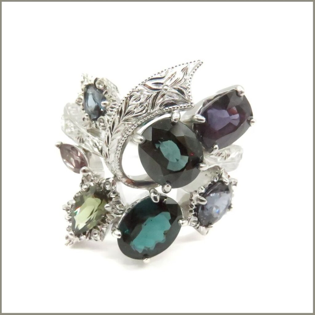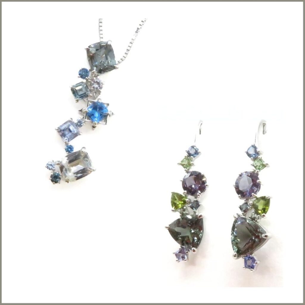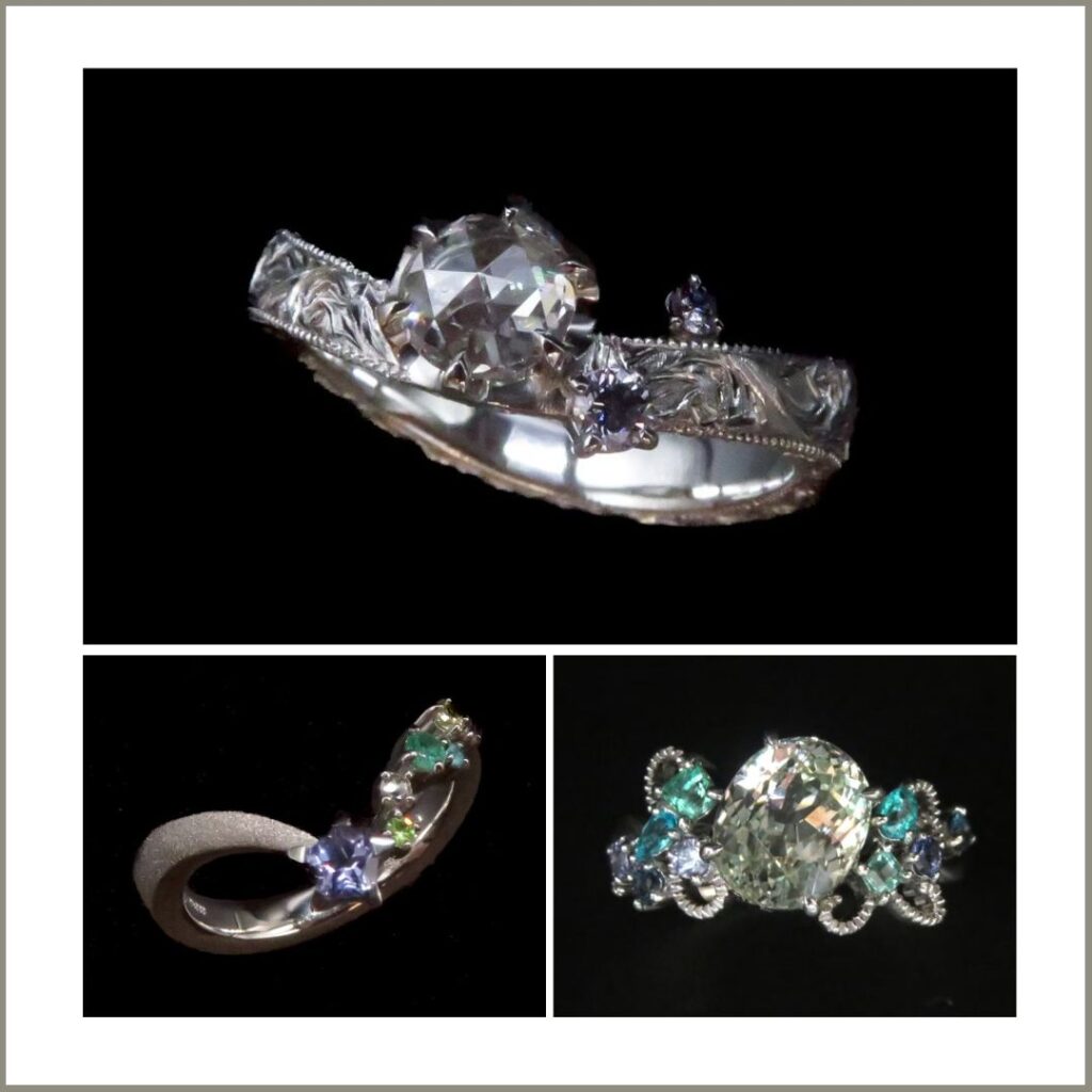 タンザナイト、デマントイドガーネット、パライバトルマリン、エメラルド、サファイア、ローズカットダイヤモンド