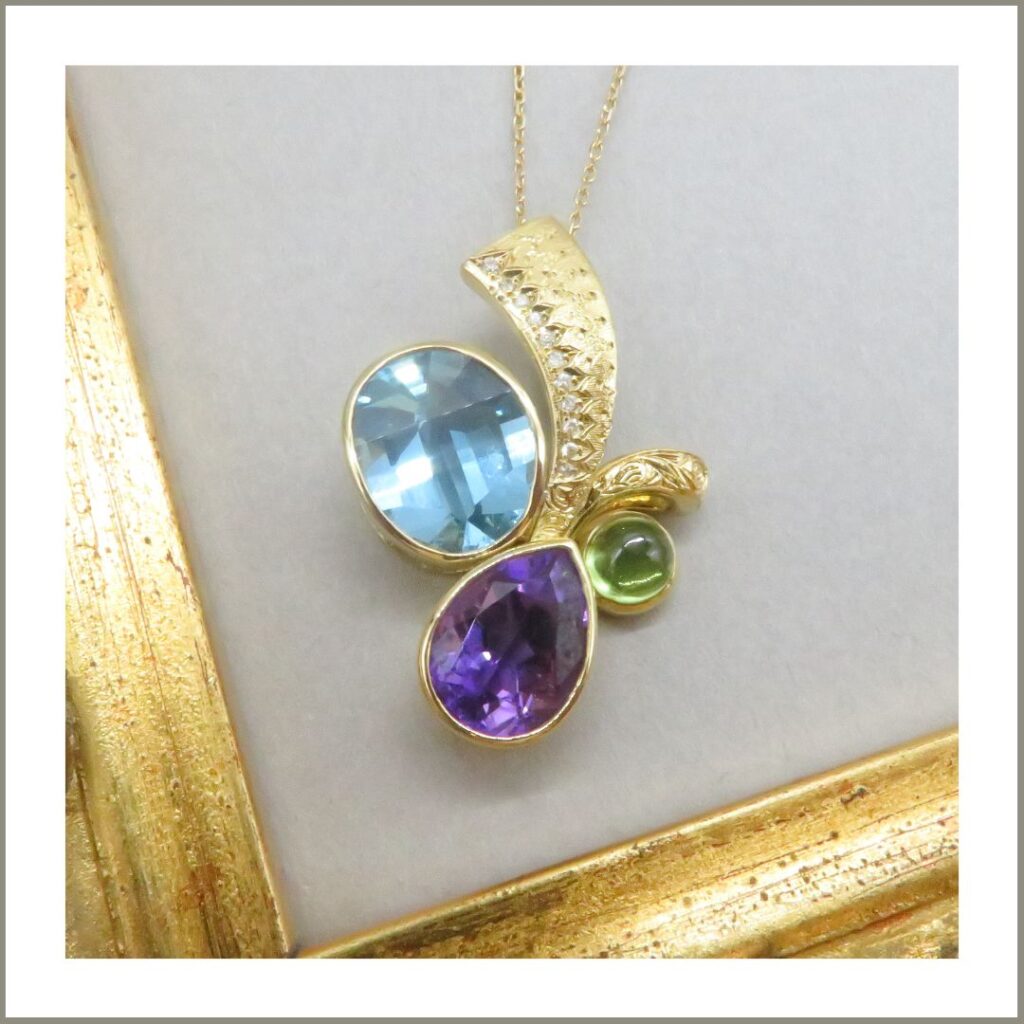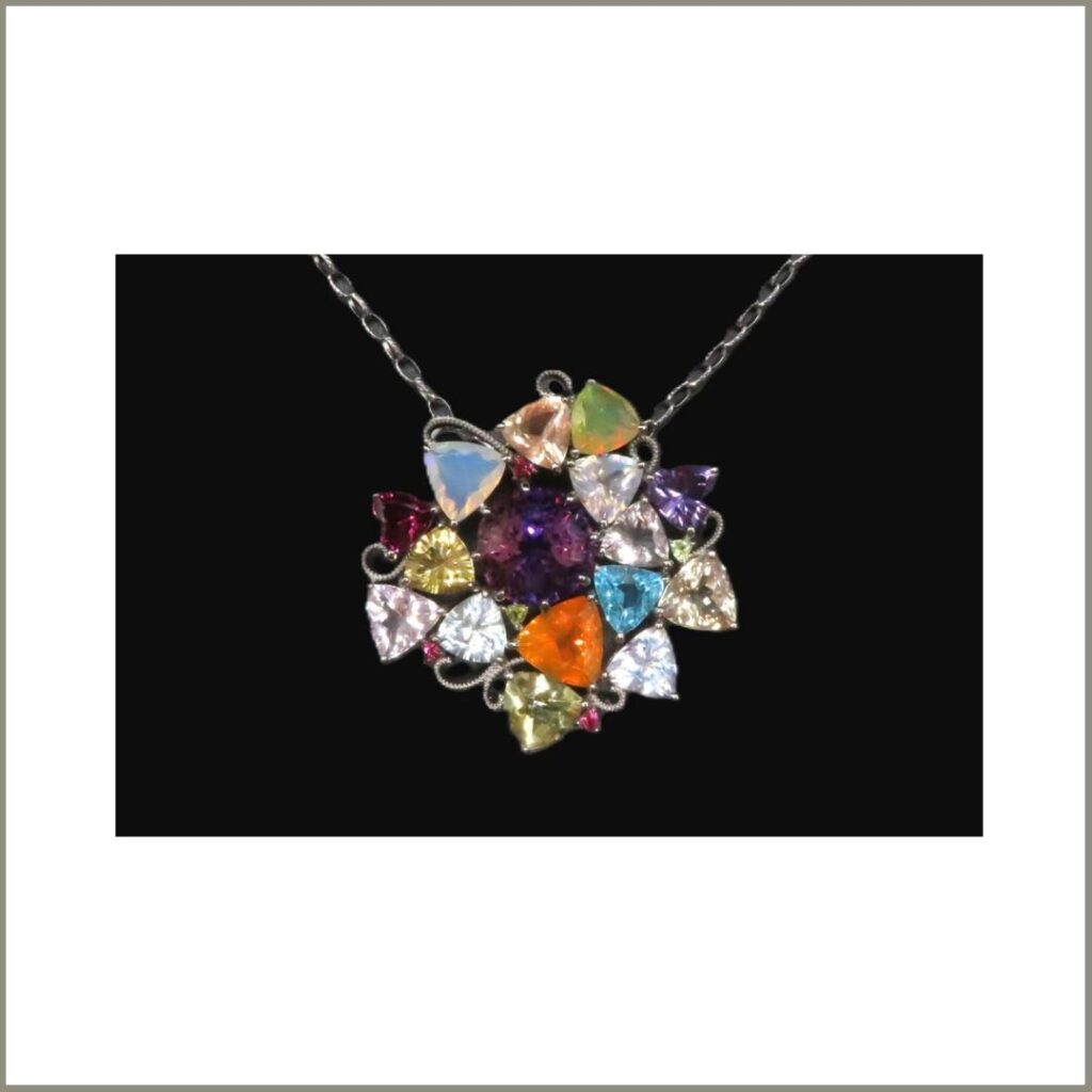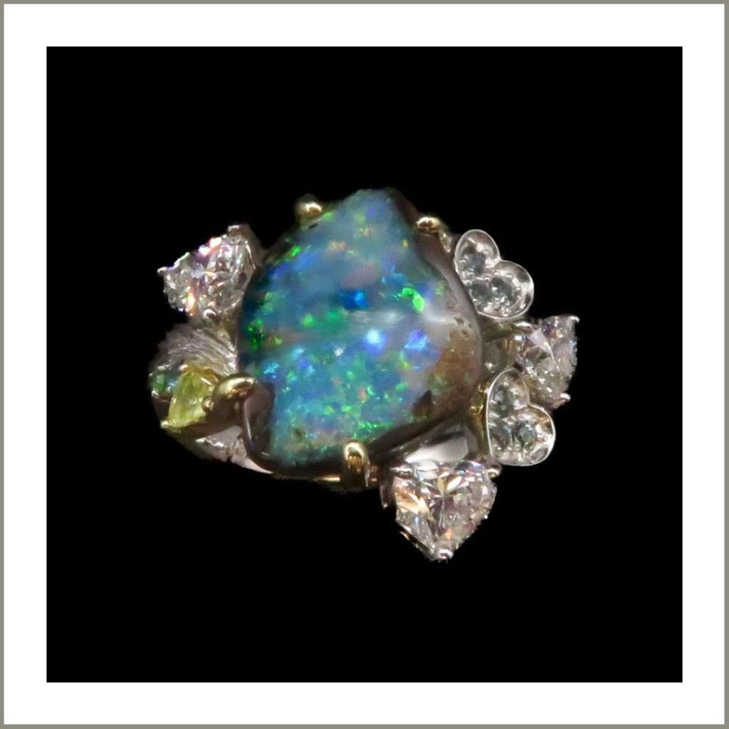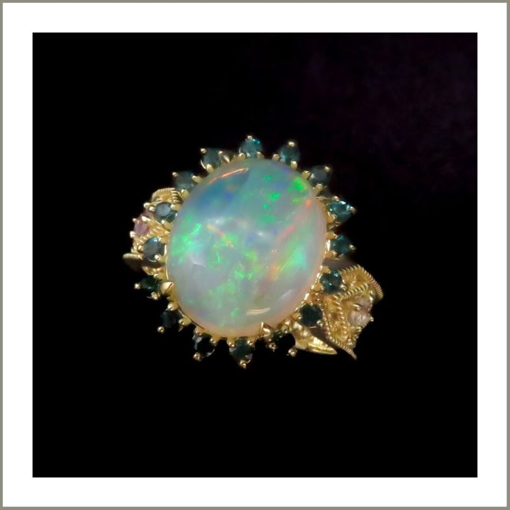 パラサイトペリドット、オパール、カラーチェンジガーネット、ベニトアイト、フェルドスパー、パライバトルマリン、レインボームーンストーン、ダイヤモンド